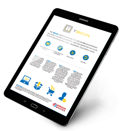 Das TBOOK tablet ist ein neuer Makosan-Service, der Informationen und Indikatoren bereitstellt, die ständig auf Ihren Makosan Packaging-Linien aktualisiert werden.